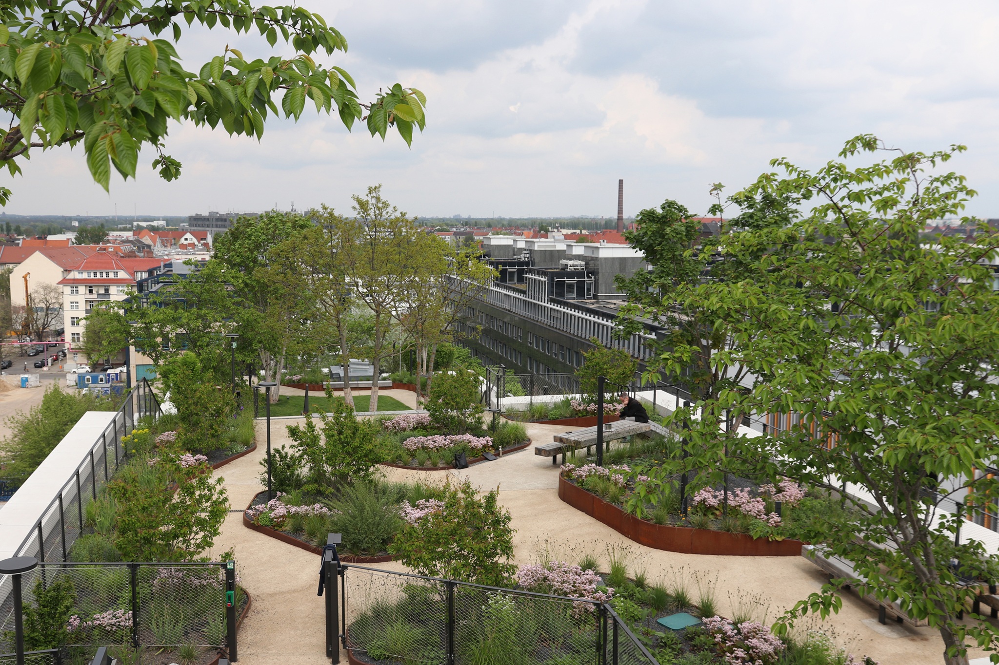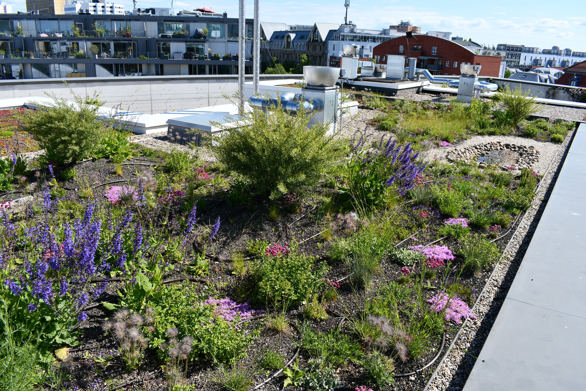 | Begeh- und nutzbare Intensivbegrünung auf einem Bürogebäude. Dachfläche vielfach genutzt. | Biodiversitätsgründach nachträglich auf einem bestehenden Wohngebäude aufgebracht. |