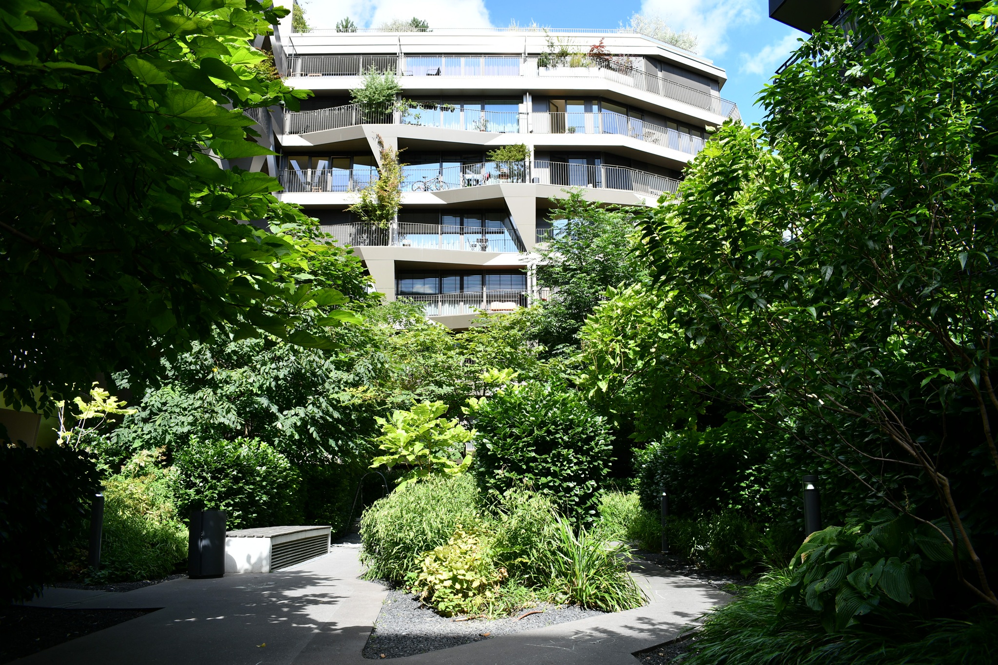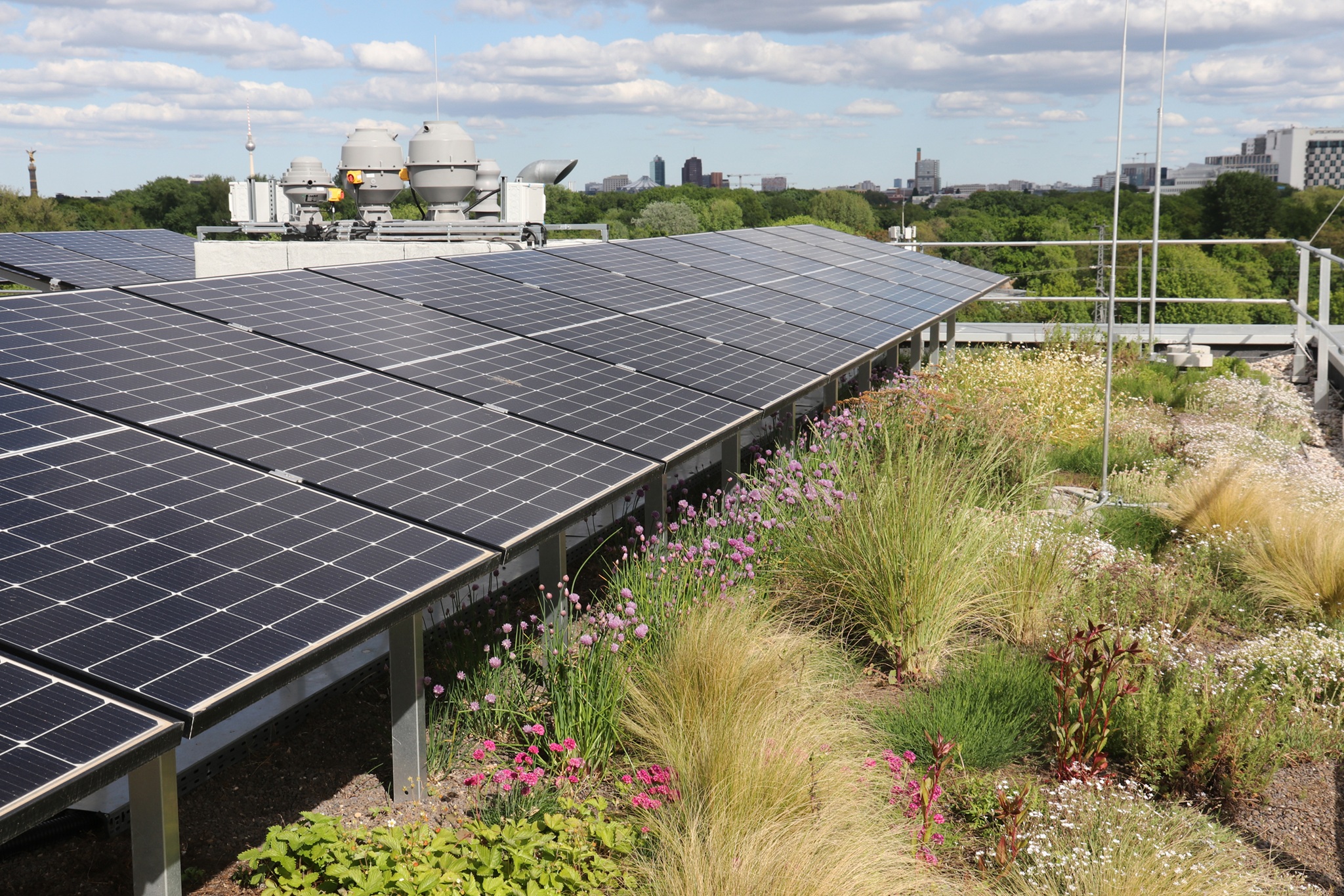 | Intensiv begrünte Tiefgarage, umgesetzt als Retentionsgründach und genutztem Innenhof einer Wohnanlage. | Alles kombiniert: Solar-Biodiversitäts-Retentionsgründach auf einem neuen Universitätsgebäude. |