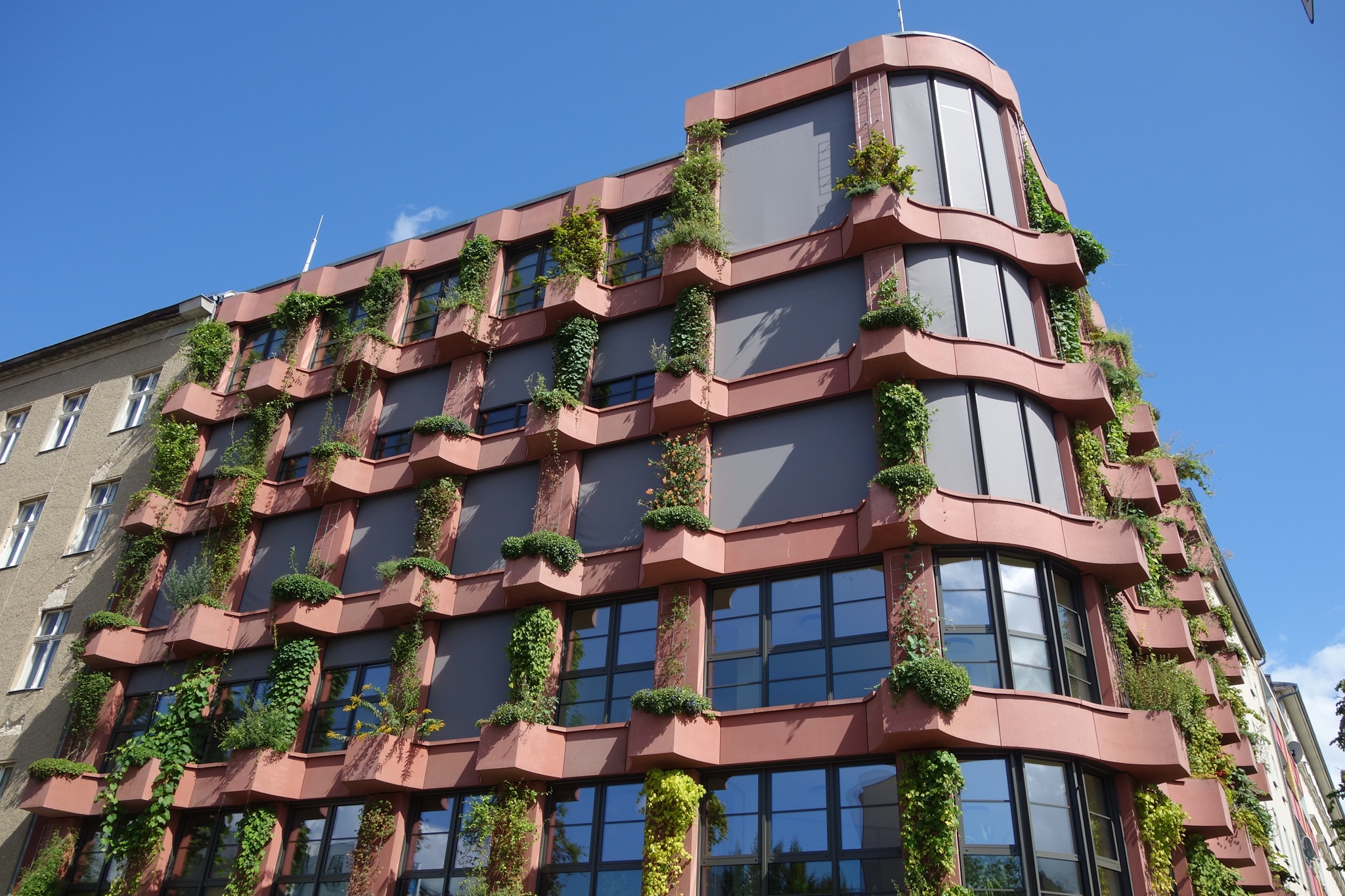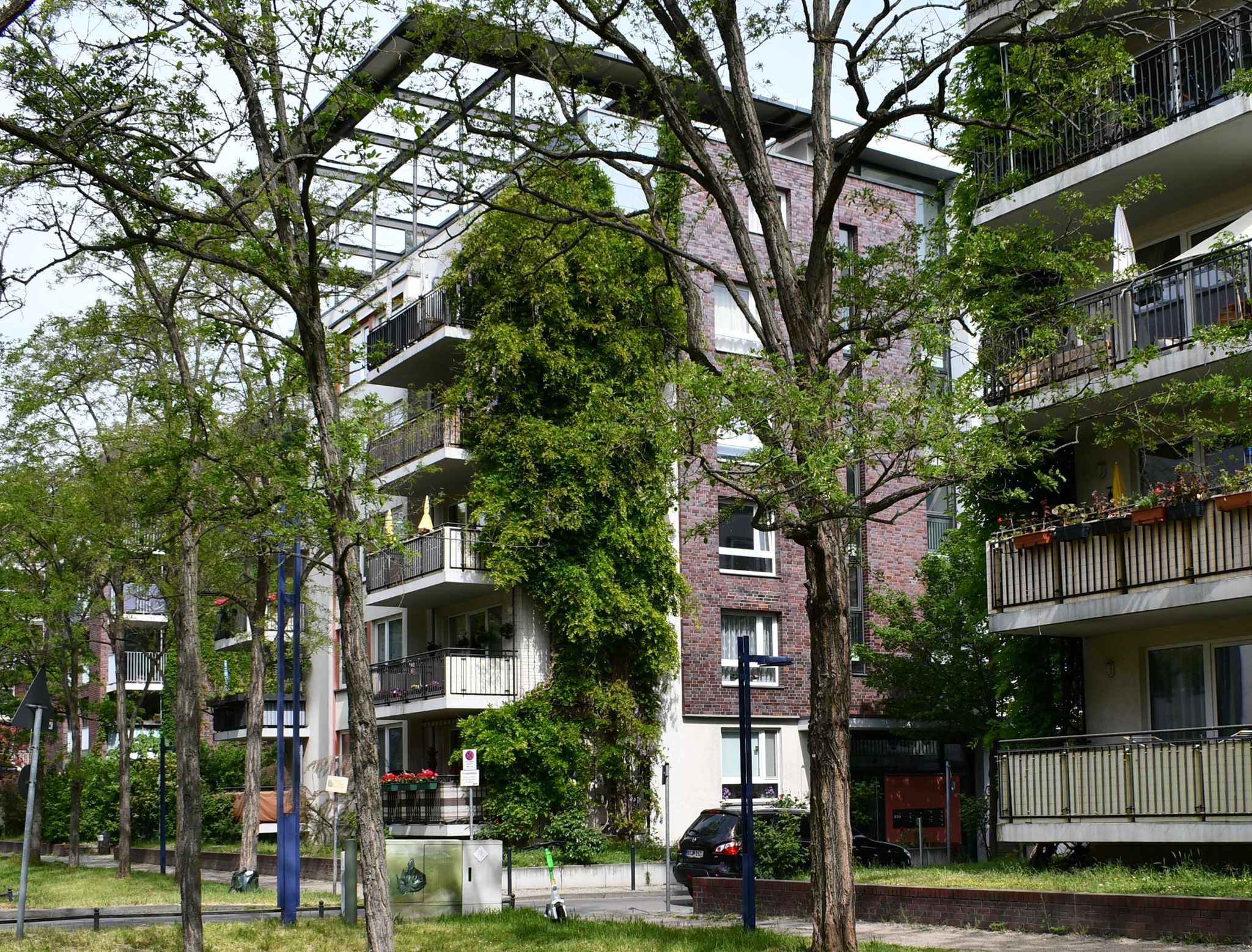 | Wandgebundene Fassadenbegrünung in Regalbauweise mit Kletterpflanzen an einem Bürogebäude. | Bodengebundene Fassadenbegrünung mit Gerüstkletterpflanzen bei etwa 20 Jahre alten Mehrfamilienhäusern. |