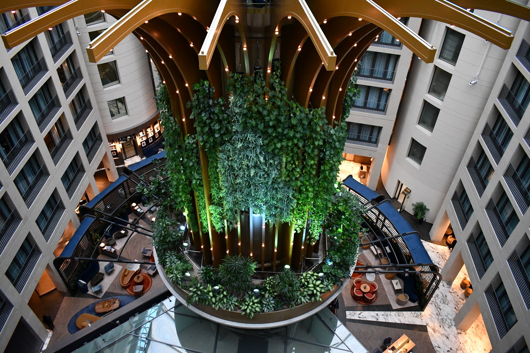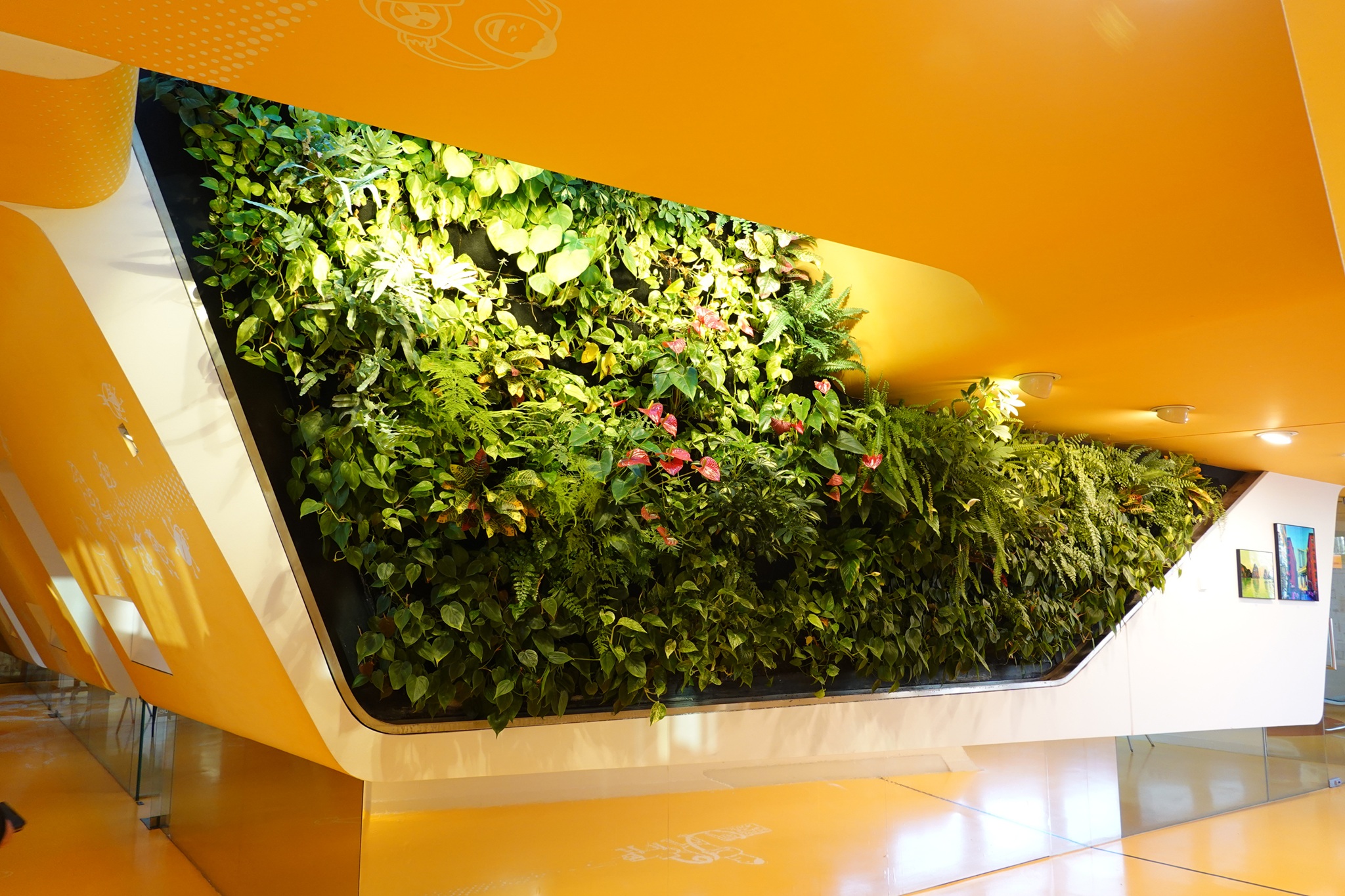 | Vertikale Innenraumbegrünung ... um Ängste zu nehmen. | Außergewöhnlich gestaltete Innenraumbegrünung mit Pflanzgefäßen im oberen Stockwerk eines Verwaltungsgebäudes. |