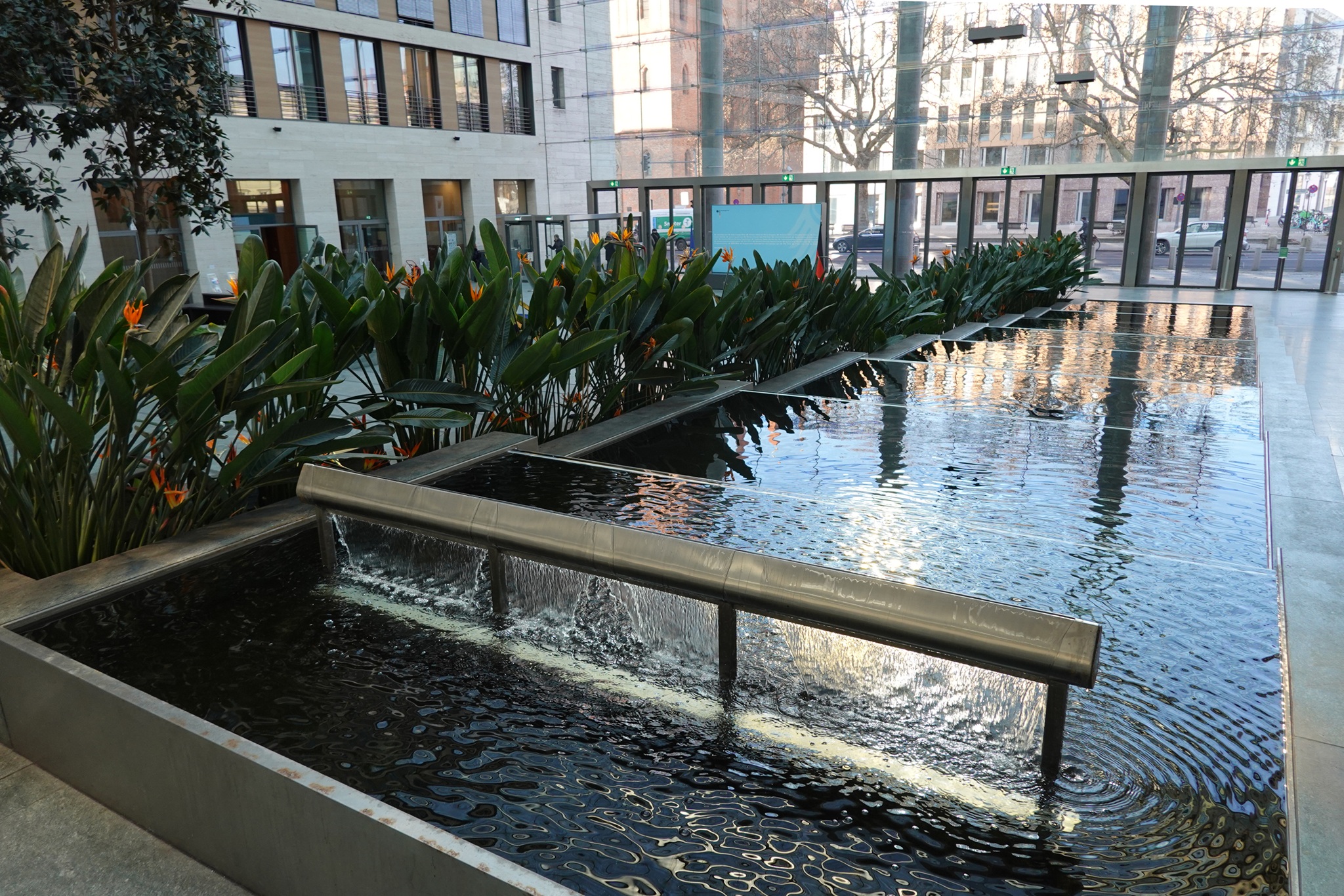 | Wandgebundene Fassadenbegrünung mit besonderer Gestaltung mit Stauden und Kletterpflanzen. | Gestaltetes Pflanzbeet im Eingangsbereich mit Wasserbecken. |